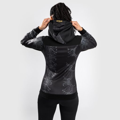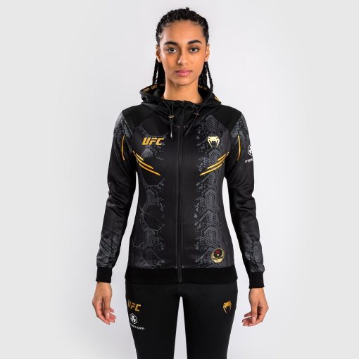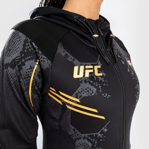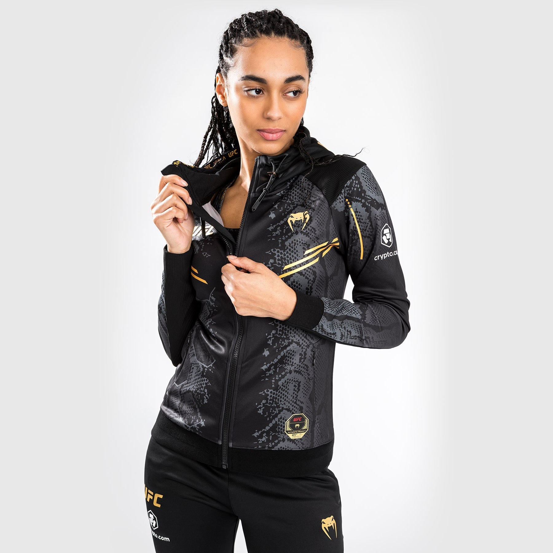 The UFC Adrenaline by Venum Authentic Fight Night Women’s Walkout Hoodie features two zippered pockets, plus a mesh-lined hood with adjustable drawstrings. The wrists and inner panel of the arms are made with a premium stretch fabric, to allow fighters to take off their hoodies without taking off their gloves.