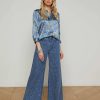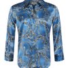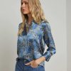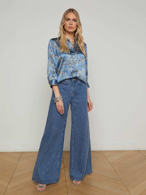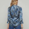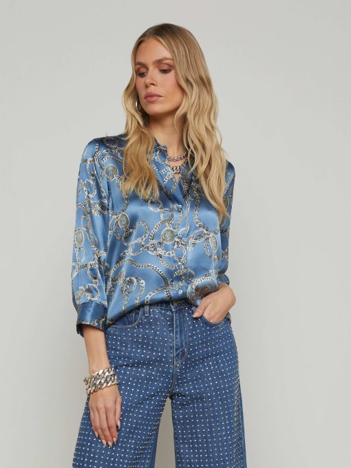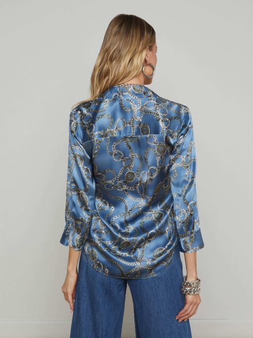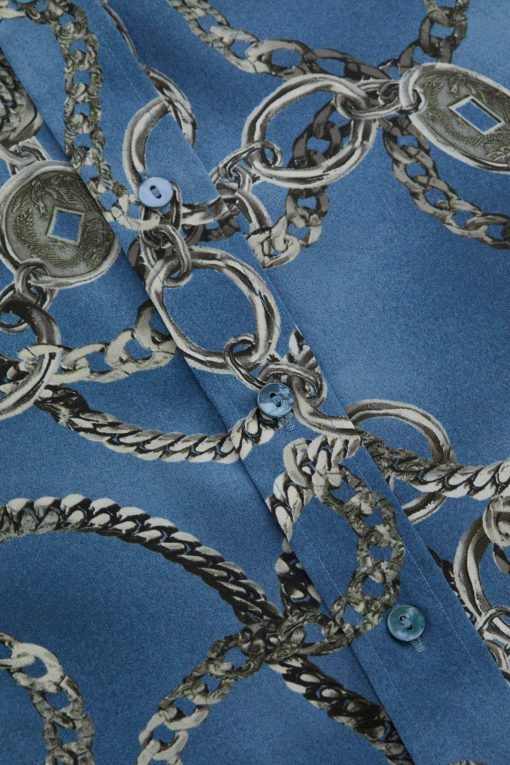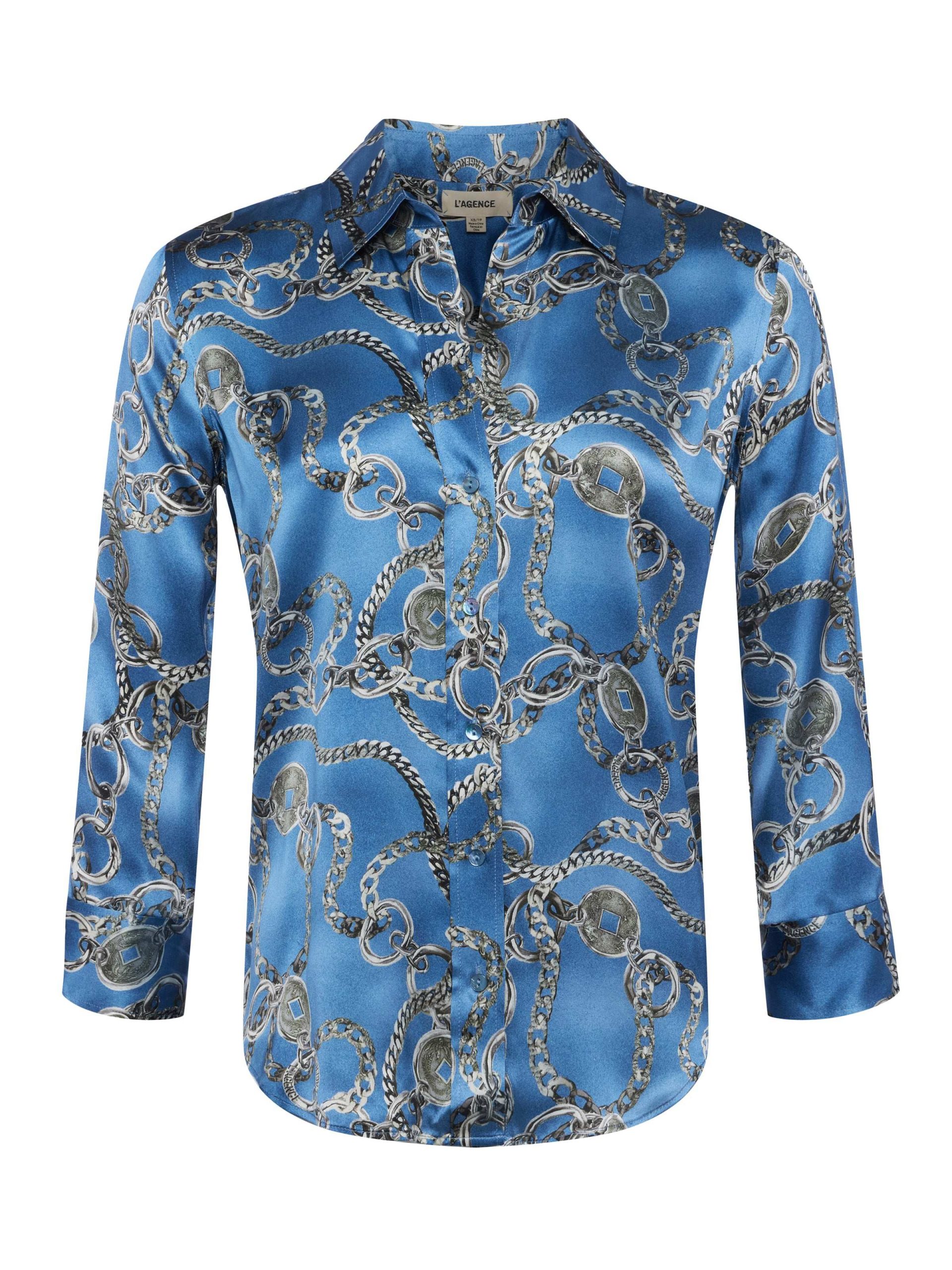 Meet the iconic silk button-down that belongs in every wardrobe. Our signature three-quarter sleeve shirt is back in ice blue with our signature chain print.