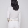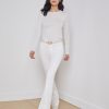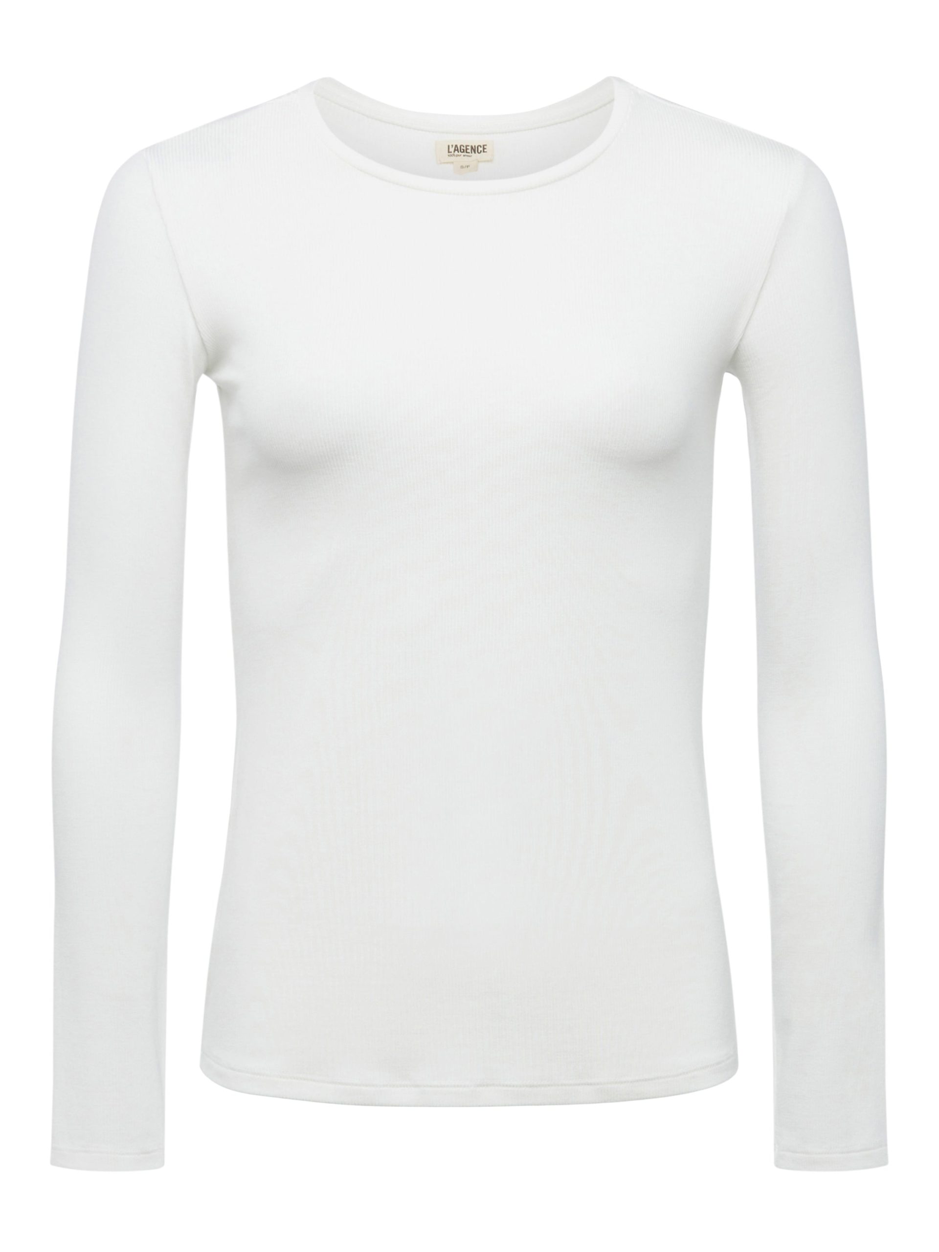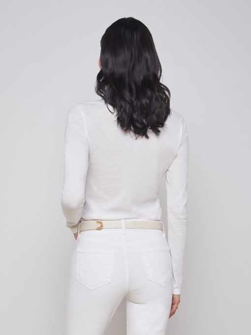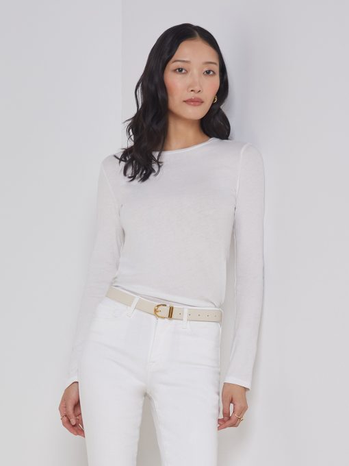 Modern and elegant slim-fit top in white. Ultra-soft microfiber jersey has a luxuriously silky hand and clings lightly to the figure. Look includes crew neck and sleek long sleeves. Beautiful wardrobe stable that works on its own or as a base layering piece.
