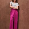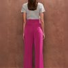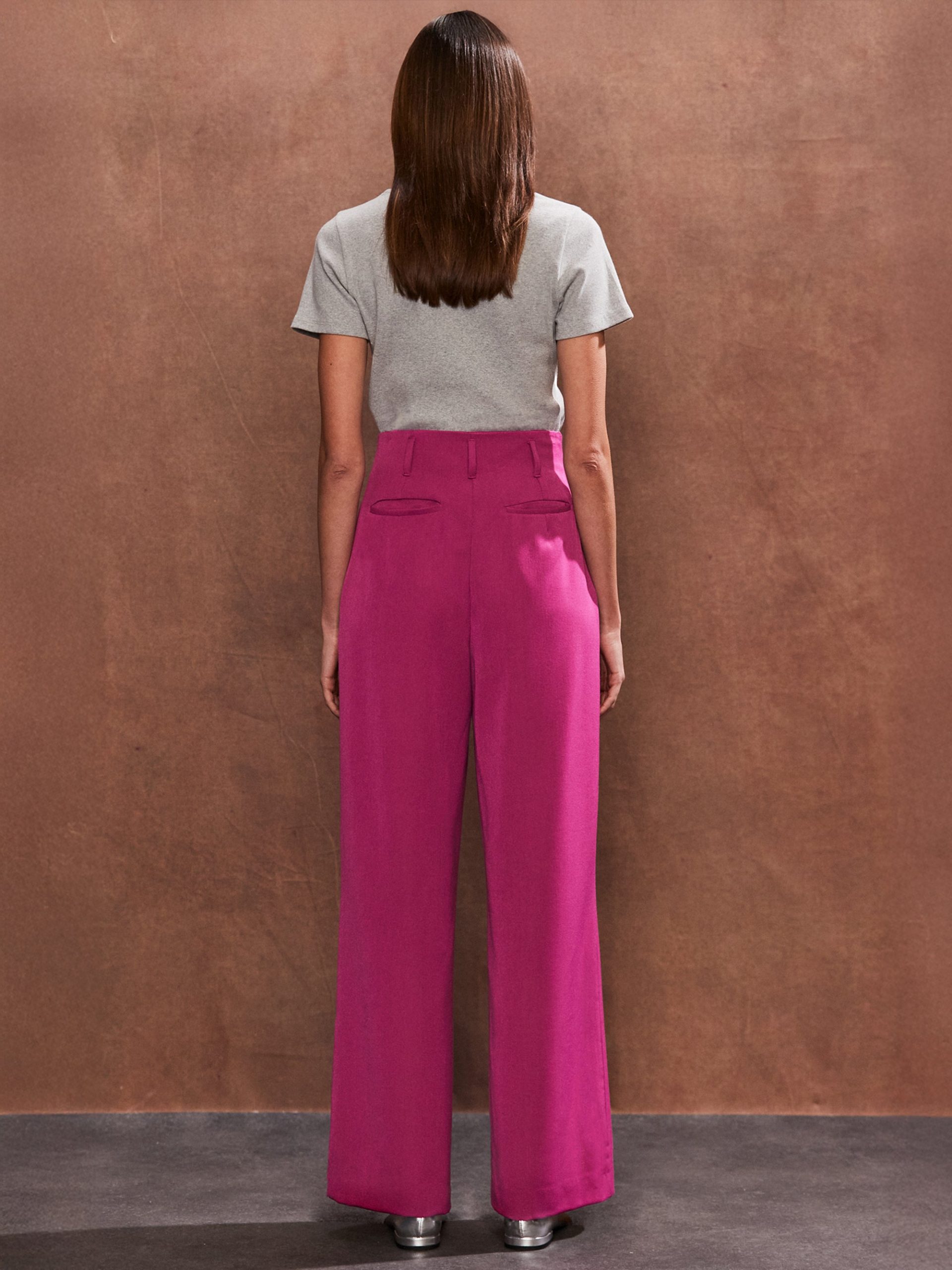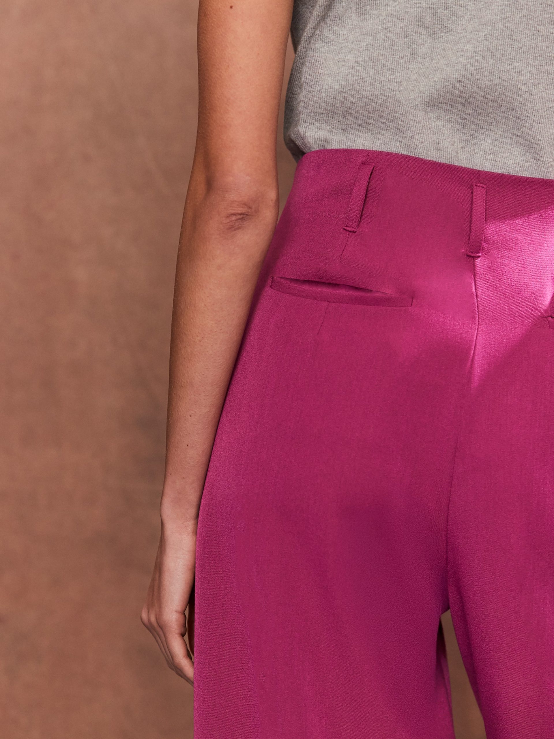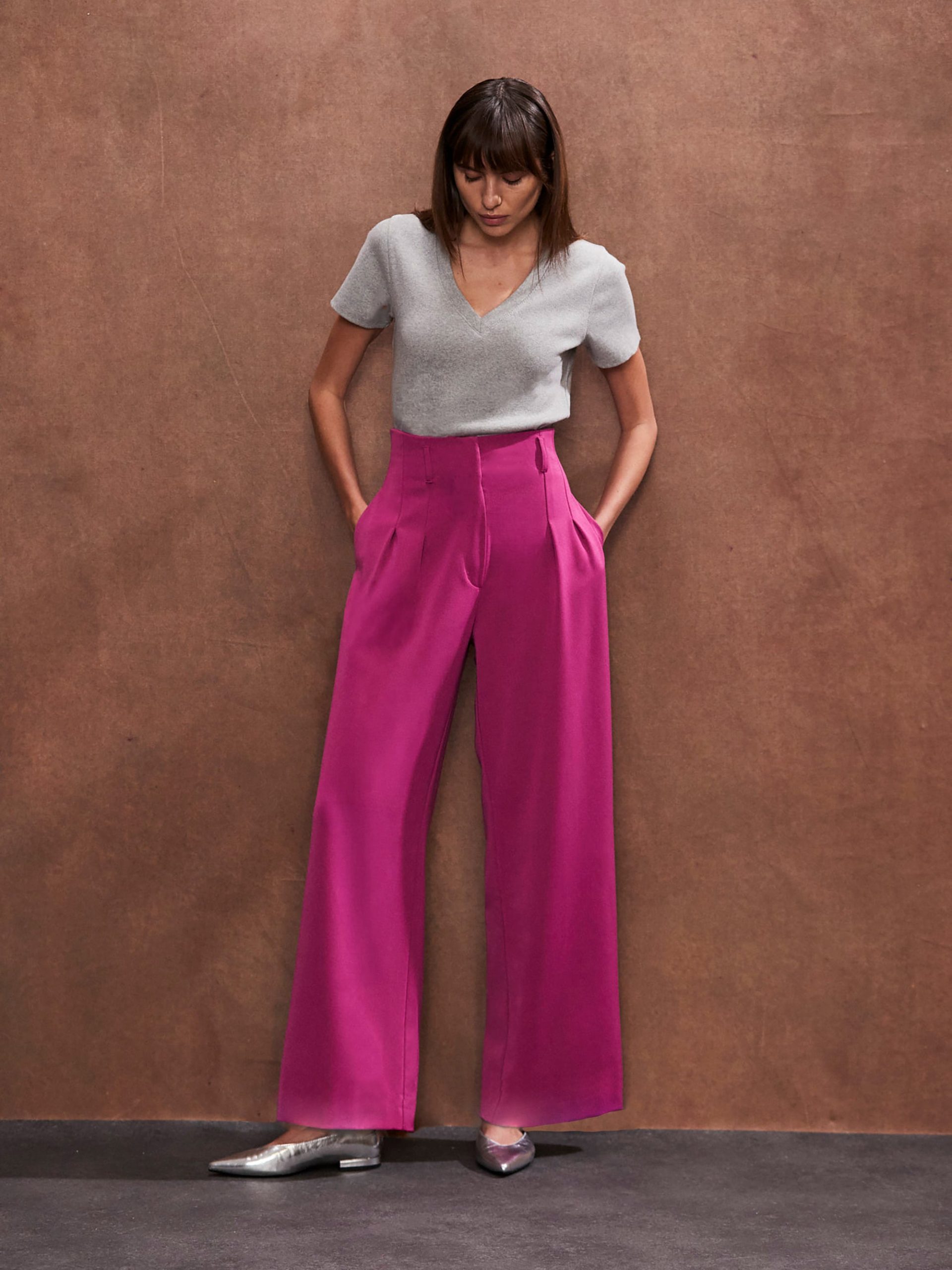 Add a pop of colour to your wardrobe with our Pink High-Waist Wide-Leg Trousers. They are designed to sit high on the waist – perfect for tucking in a T-shirt – and flare out into a wide-leg silhouette. They have belt loops, slant pockets and artful draping for the most flattering finish. Styling-wise, go for neutrals and metallic accessories – a white tee and silver flats work well.